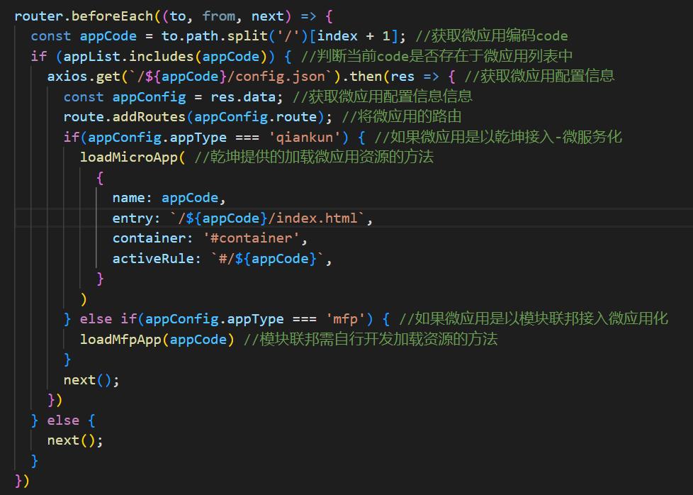 這里需要注意的是,考慮到微應用的動態(tài)加載,加載器加載的微應用個數(shù)不做限制,如一次性將所有的微應用路由全部加載,勢必會造成路由數(shù)據(jù)過于龐大,因此初始化時只注冊中心路由,微應用對應的頁面路由,則在第一次進入當前微應用的時候創(chuàng)建。此步驟放在loader加載器中實現(xiàn)。