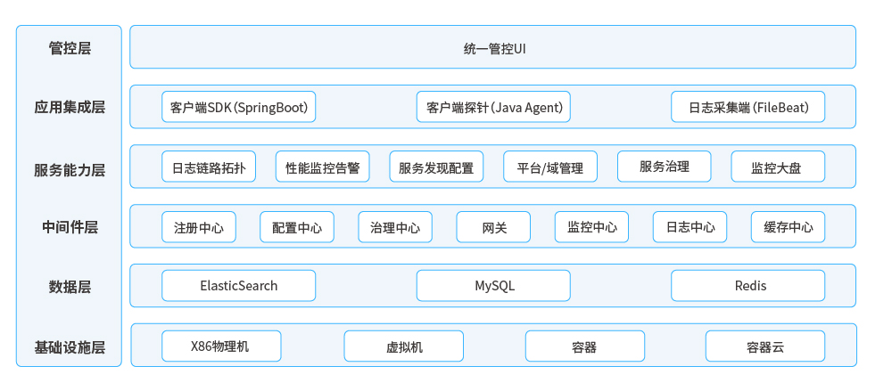 ● 中間件層:平臺所依賴的中間件,以開源為主,二次開發和私有實現為輔,包括注冊中心、配置中心、治理中心、網關中心、監控中心、日志中心、告警中心等;