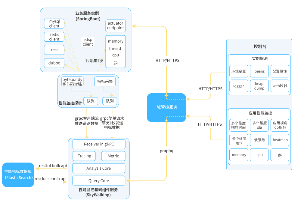 ● 性能監控:為了實現對業務應用的零代碼侵入,可采用Java探針技術實現對微服務應用的性能數據采集,如Skywalking APM Agent;從應用、集群、端口等維度收集性能數據,性能數據包括但不局限于:服務可用級別、響應時間、每分鐘調用數、百分位響應耗時、CPU、內存、GC情況等。應用實例通過平臺SDK注冊到平臺獲取到APM組件信息,通過APM組件客戶端對APM組件進行相關初始化操作,之后依托Agent字節碼增強技術在相應位置進行埋點,定時將性能數據推送至APM組件進行分析并持久化;平臺本身通過訪問APM組件暴露的端點獲取相關性能數據。